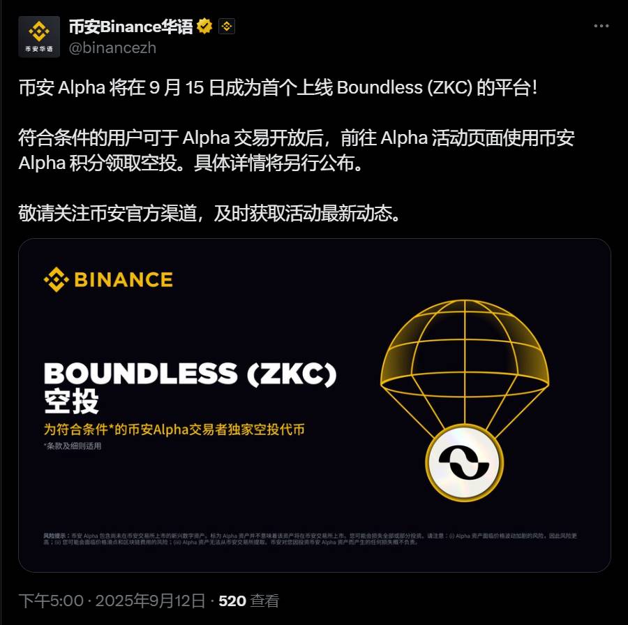 币安 Alpha 将在 9 月 15 日上线 Boundless (ZKC),符合条件的用户可申领空投