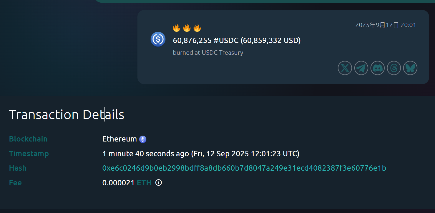 深潮 TechFlow 消息,9 月 12 日,据 Whale Alert 监测, 约 2 分钟前,USDC Treasury 在以太坊链上销毁 60,876,255 枚 USDC 代币,价值约 60,859,332 美元。