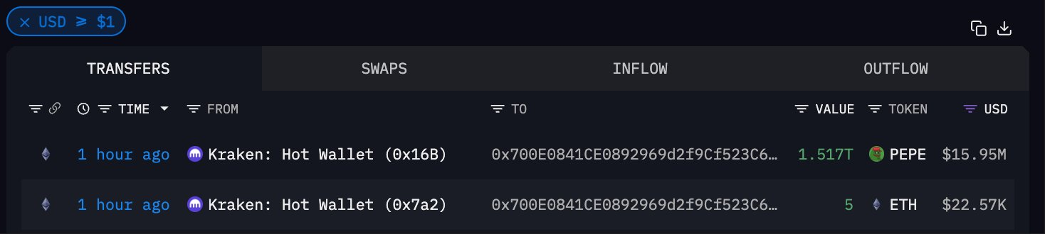 某鲸鱼于 1 小时前从 Kraken 提取价值 1595 万美元 PEPE 代币