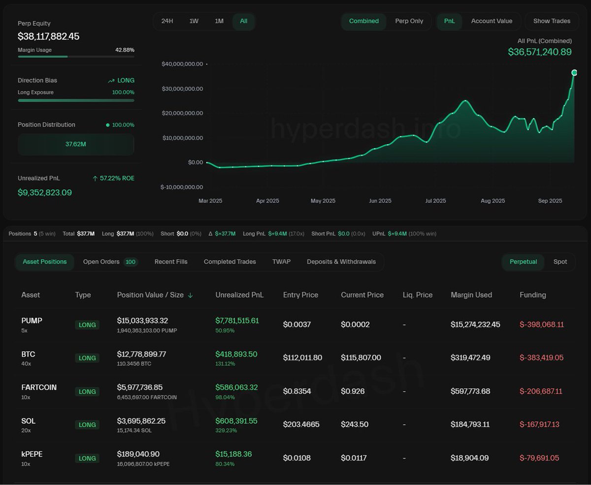 该交易者还持有 $BTC 、 $FARTCOIN 、 $SOL 、 $PEPE 等多个多头仓位,总利润超过 3600 万美元。