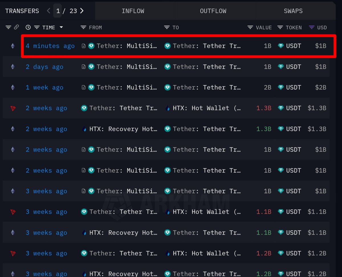 Tether 刚刚于以太坊网络增发 10 亿枚 USDT