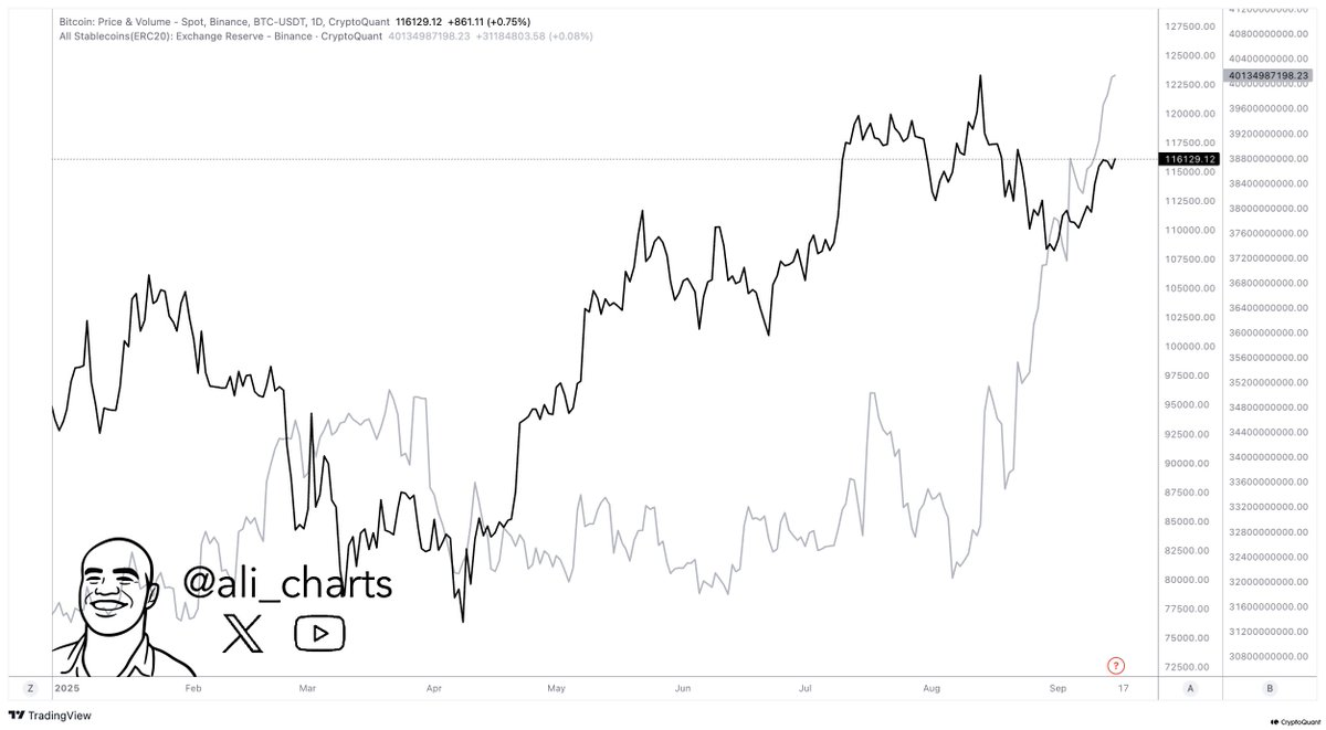 深潮 TechFlow 消息,9 月 16 日,据链上分析师 Ali(@ali_charts)监测,币安稳定币储备达 400 亿美元,创历史新高。