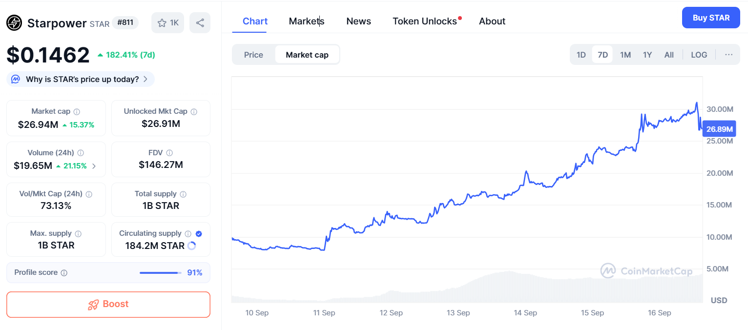 Starpower(STAR)市值短时触及 3100 万美元,近 7 天涨幅为182.23%