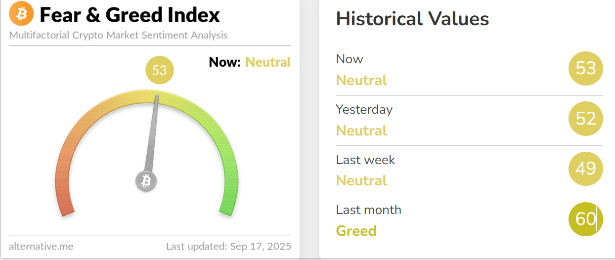 今日恐慌与贪婪指数升至 53,仍处于「中性状态」