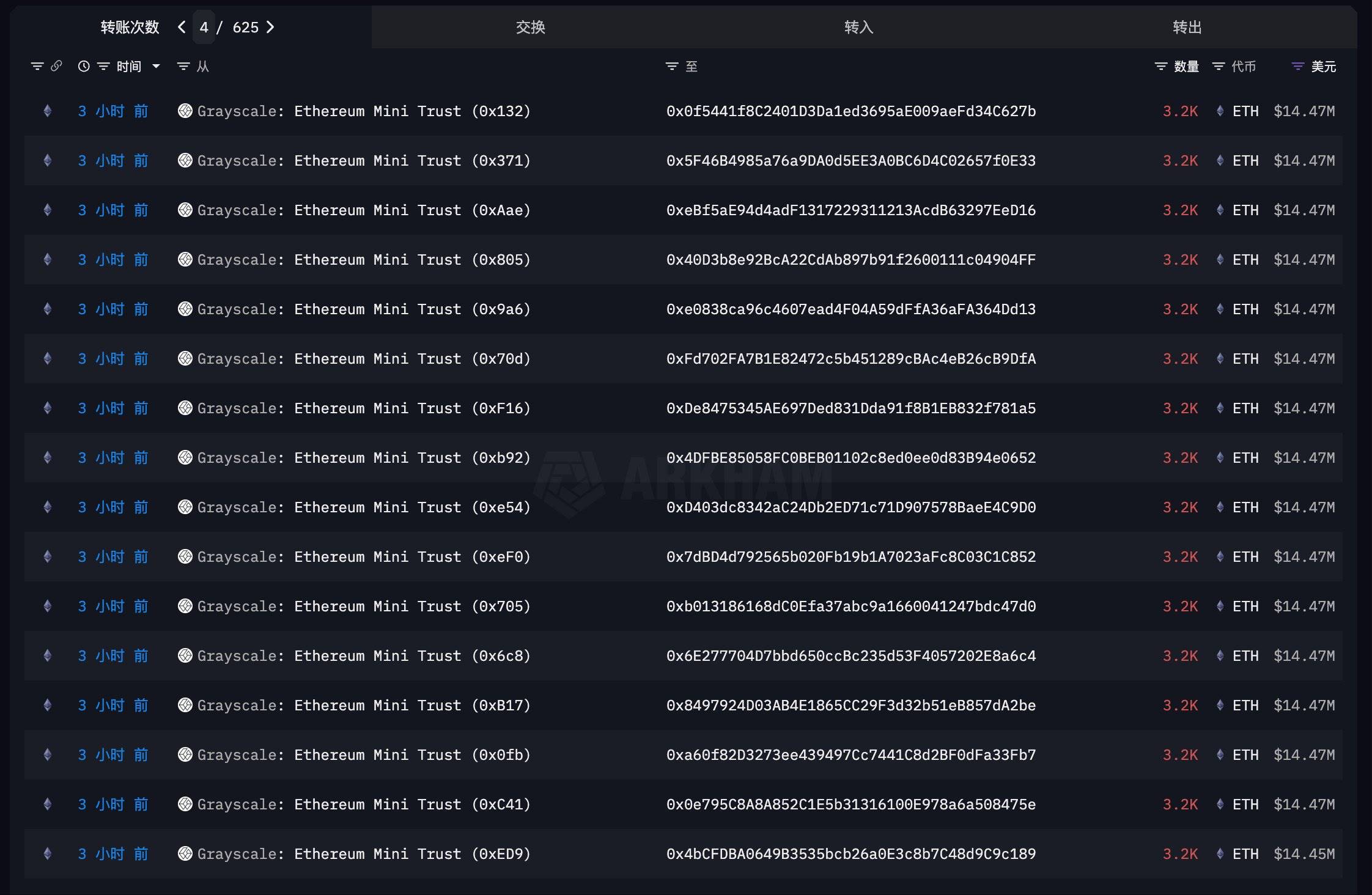 灰度 Ethereum Mini Trust ETF 地址向 67 个新钱包转移 21.44 万枚 ETH,价值约 9.67 亿美元