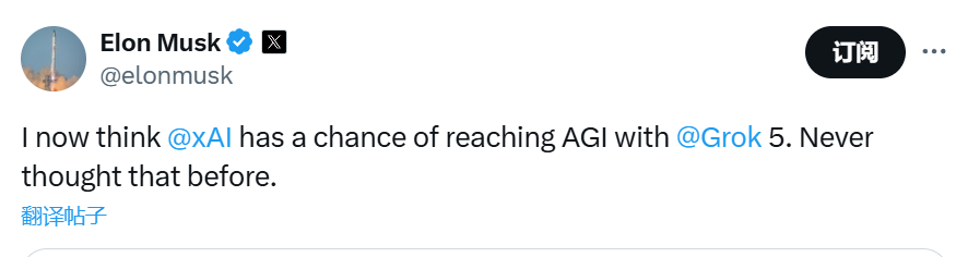 深潮 TechFlow 消息,9 月 17 日,马斯克在社交媒体发文称,Grok 5 将在几周后开始训练。我现在认为 xAI 有望通过 Grok 5 达到 AGI,此前从未做出如此设想。