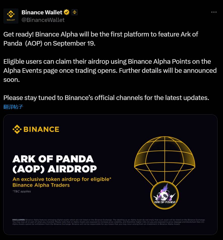 币安 Alpha 将在 9 月 19 日上线 AOP,符合条件的用户可申领空投