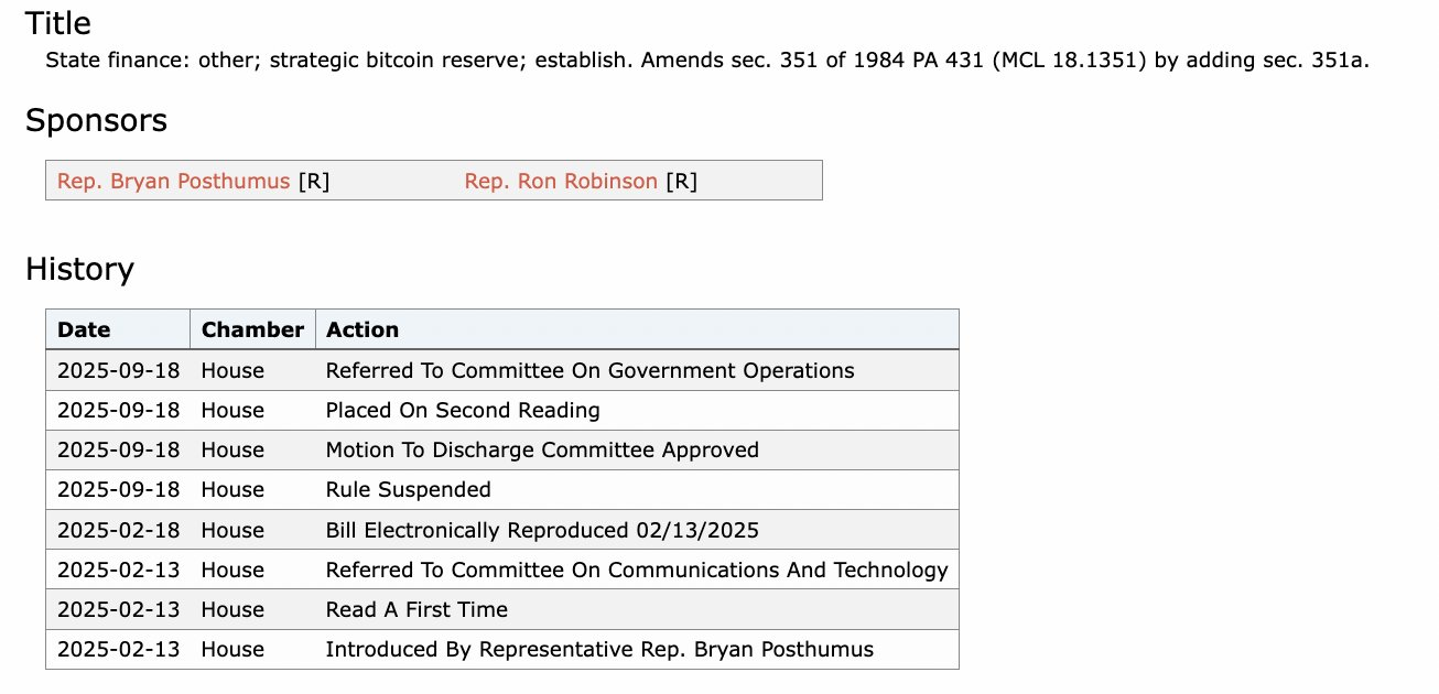 深潮 TechFlow 消息,9 月 19 日,据 Cointelegraph 报道,密歇根州比特币储备法案 HB 4087 自 2 月以来首次取得进展,已推进至众议院二读阶段,并被提交至政府运营委员会审议。