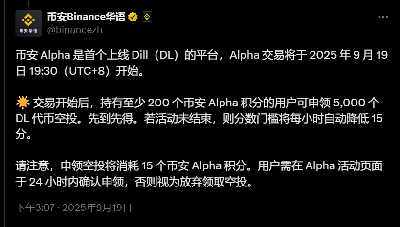 币安 Alpha:Dill(DL)空投申领门槛为 200 Alpha 积分,先到先得