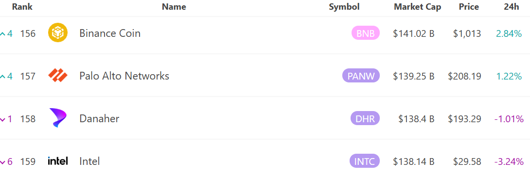 BNB市值突破1400亿美元,超越英特尔跻身全球资产市值排名156位