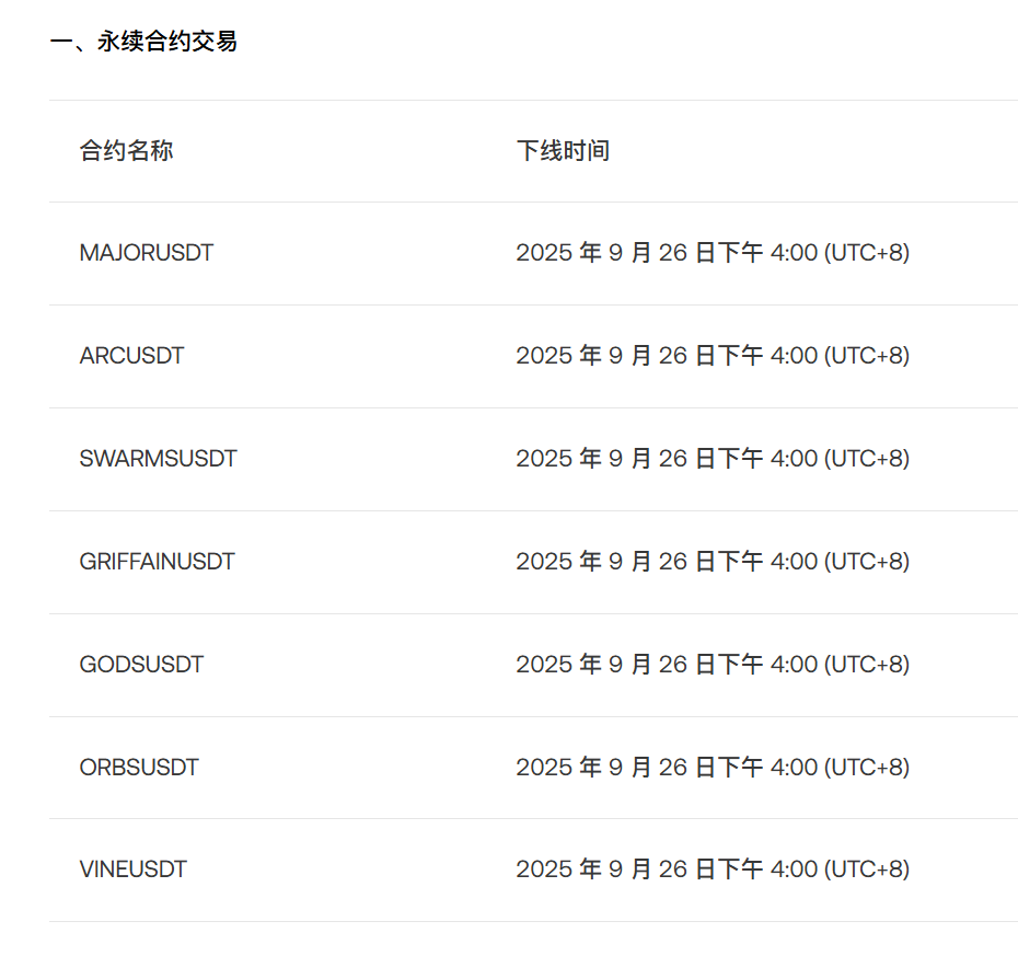 深潮 TechFlow 消息,9 月 22 日,据官方公告,OKX 将于 2025 年 9 月 26 日下午 4:00 下线以下永续合约:MAJOR USDT、ARC USDT、SWARMS USDT、GRIFFAIN USDT、GODS USDT、ORBS USDT 和 VINE USDT。