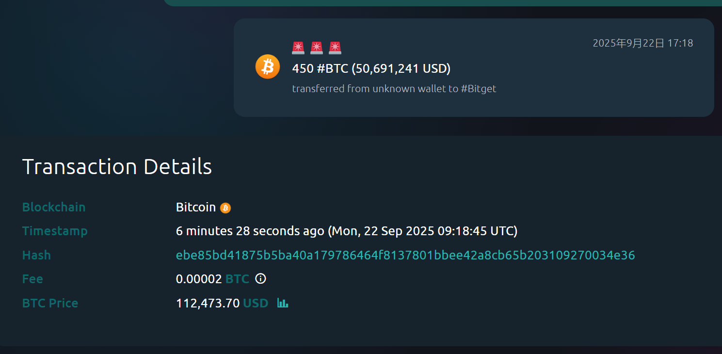 某鲸鱼约 6 分钟前向 Bitget 转入 450 枚 BTC,价值超 5000 万美元
