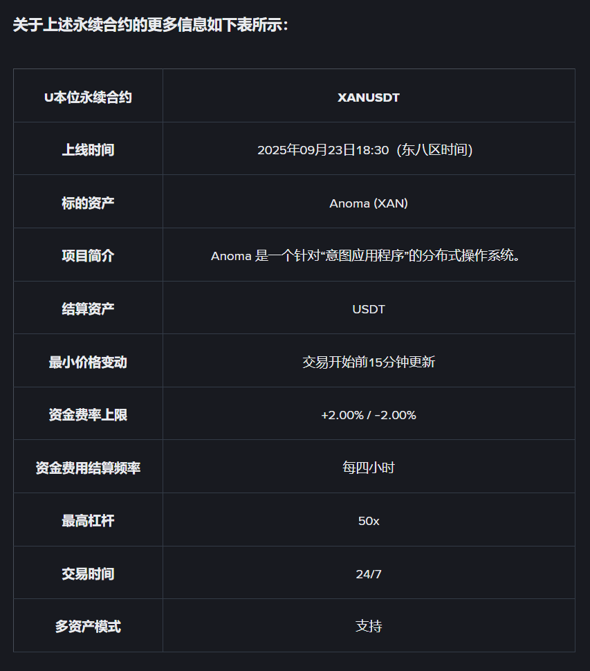 深潮 TechFlow 消息,9 月 22 日,据官方公告,币安Alpha将于2025年09月23日18:00(东八区时间)上线和开放Anoma (XAN) 的交易。此外,币安合约平台将于2025年09月23日18:30(东八区时间)上线XANUSDT永续合约,最高杠杆可达50倍。