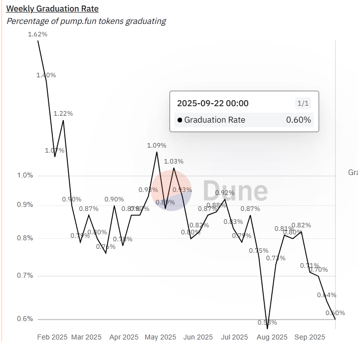 深潮 TechFlow 消息,9 月 22 日,据 Dune 用户 @adam_tehc 看板数据,Pump.fun 代币毕业率近一个月已连续四周出现下滑趋势。过去一周(9 月 15 日至 9 月 21 日)Pump.fun 代币周毕业率仅为 0.6%,该数值接近 7 月 28 日创下的历史最低点 0.58%。