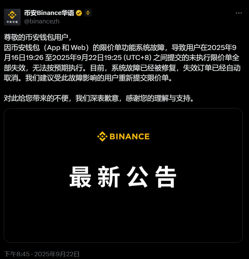 深潮 TechFlow 消息,9 月 22 日,据官方公告,因币安钱包(App 和 Web)的限价单功能系统故障,导致用户在2025年9月16日19:26 至2025年9月22日19:25 (UTC+8) 之间提交的未执行限价单全部失效,无法按预期执行。