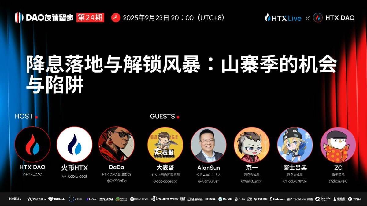 深潮 TechFlow 消息,9 月 23 日,据HTX DAO官方社媒消息,《DAO 友请留步》第24期将于今日20时(UTC+8)开播。本期节目以“降息落地与解锁风暴:山寨季的机会与陷阱?”为主题,HTX上币治理观察员大表哥,知名Web3主持人Alan Sun,蓝鸟会成员京一、医士吕奥,撸毛菜鸡ZC等加密KOL,将深入探讨降息节奏如何塑造主流币的短期行情,以及山寨季是否还会如期而至等热门话题。