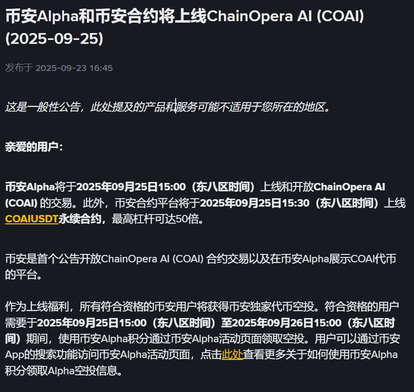 币安Alpha和币安合约将于9月25日上线ChainOpera AI (COAI)