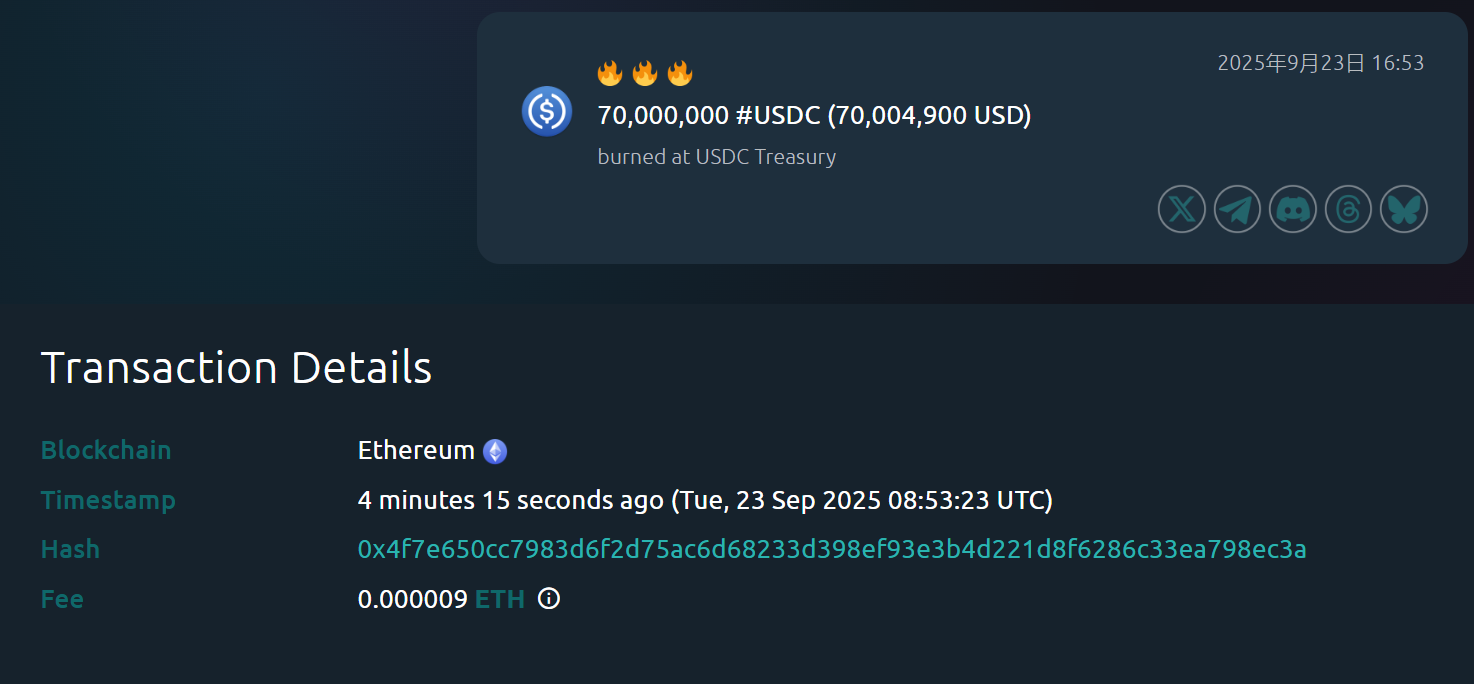 USDC Treasury 约 5 分钟前在以太坊链上销毁 7000 万枚 USDC