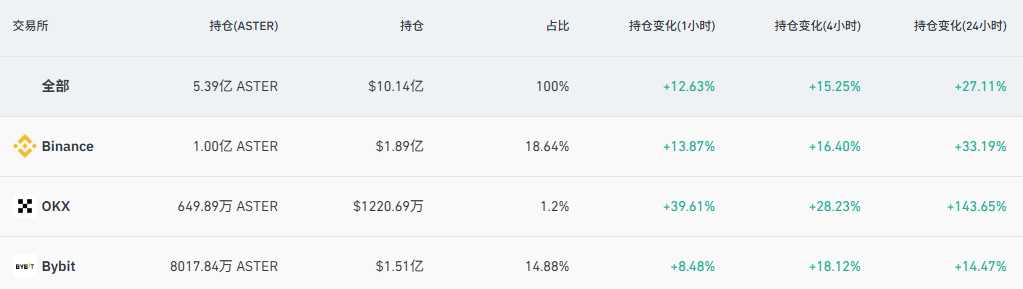 深潮 TechFlow 消息,9 月 23 日,据Coinglass最新数据显示,全网ASTER合约持仓量已增至5.391亿枚,持仓市值突破10亿美元,现报10.14亿美元,过去24小时增幅达27.11%;其中币安ASTER合约持仓量触及1.00亿枚,位列第一,持仓市值为1.89亿美元;Bybit的ASTER合约持仓量触及8017.84万枚,持仓市值为1.51亿美元。
