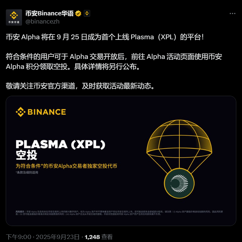 币安 Alpha 将在 9 月 25 日上线 Plasma(XPL),符合条件的用户可申领空投