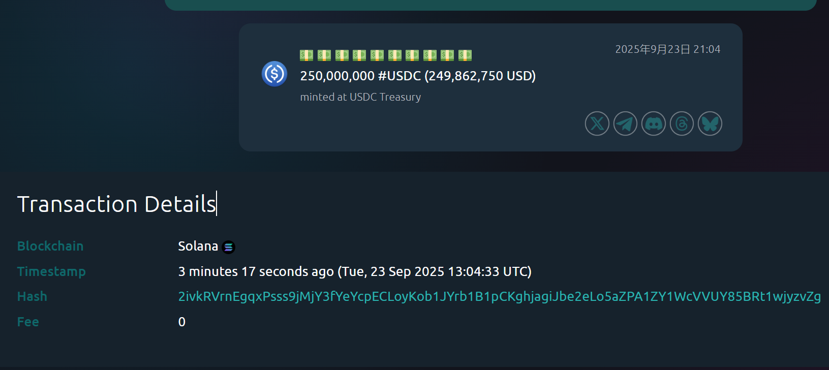 深潮 TechFlow 消息,9 月 23 日,据 Whale Alert 监测,USDC Treasury 约 5 分钟前在 Solana 链上铸造 250,000,000 枚 USDC。