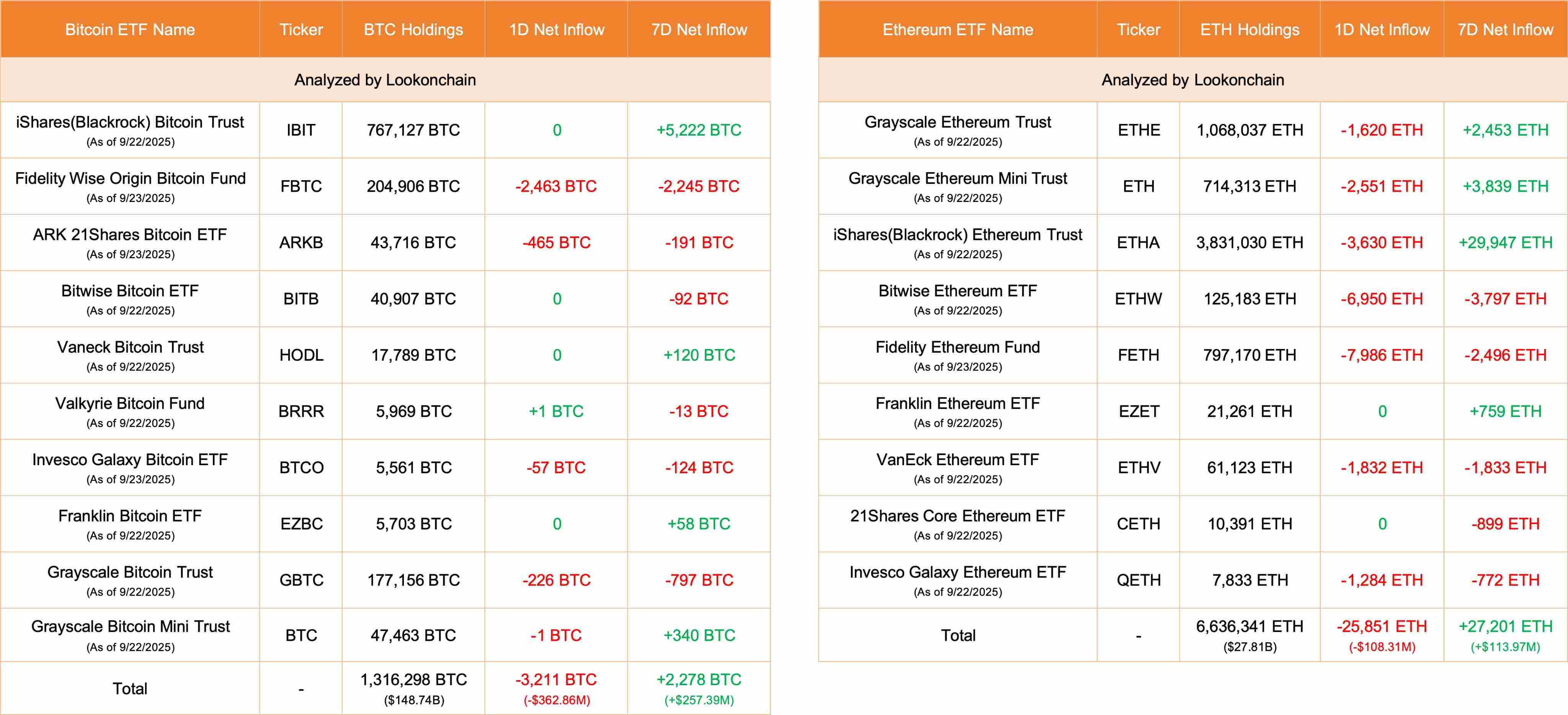 深潮 TechFlow 消息,9 月 23 日,据 Lookonchain 监测,截止于发稿,今日 10 只美国比特币 ETF 净流出 3,211 枚 BTC,9 只以太坊 ETF 净流出 25,851 枚 ETH。