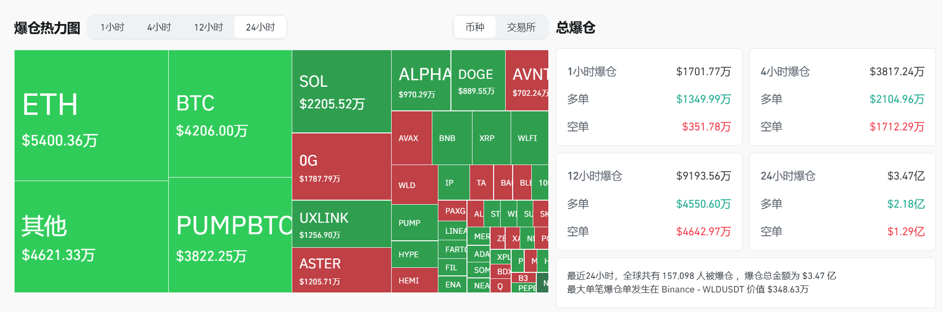 过去 24 小时全网爆仓 3.47 亿美元,主爆多单