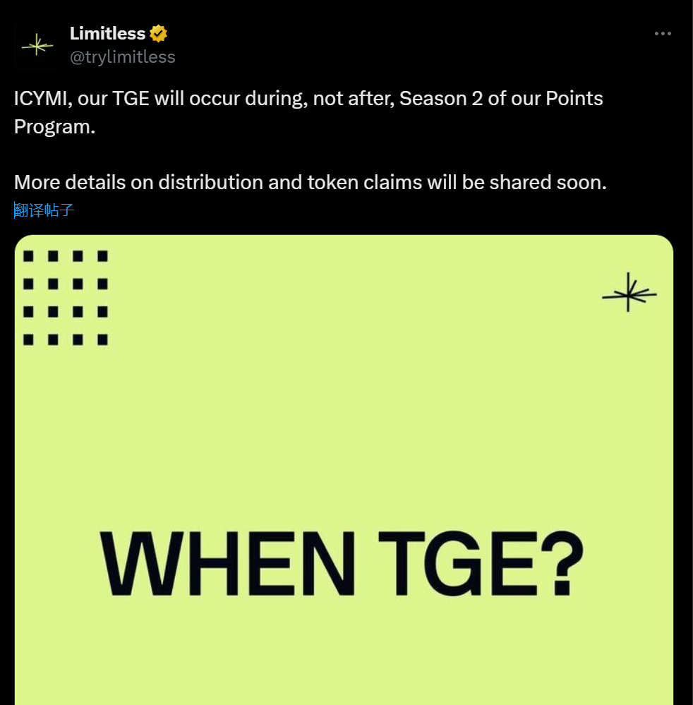 深潮 TechFlow 消息,9 月 24 日,据 Base 预测市场 Limitless 披露,该项目的 TGE 将在其积分计划第二季期间进行,而非在第二季结束后进行。有关代币分发和代币领取的更多详细信息将很快公布。