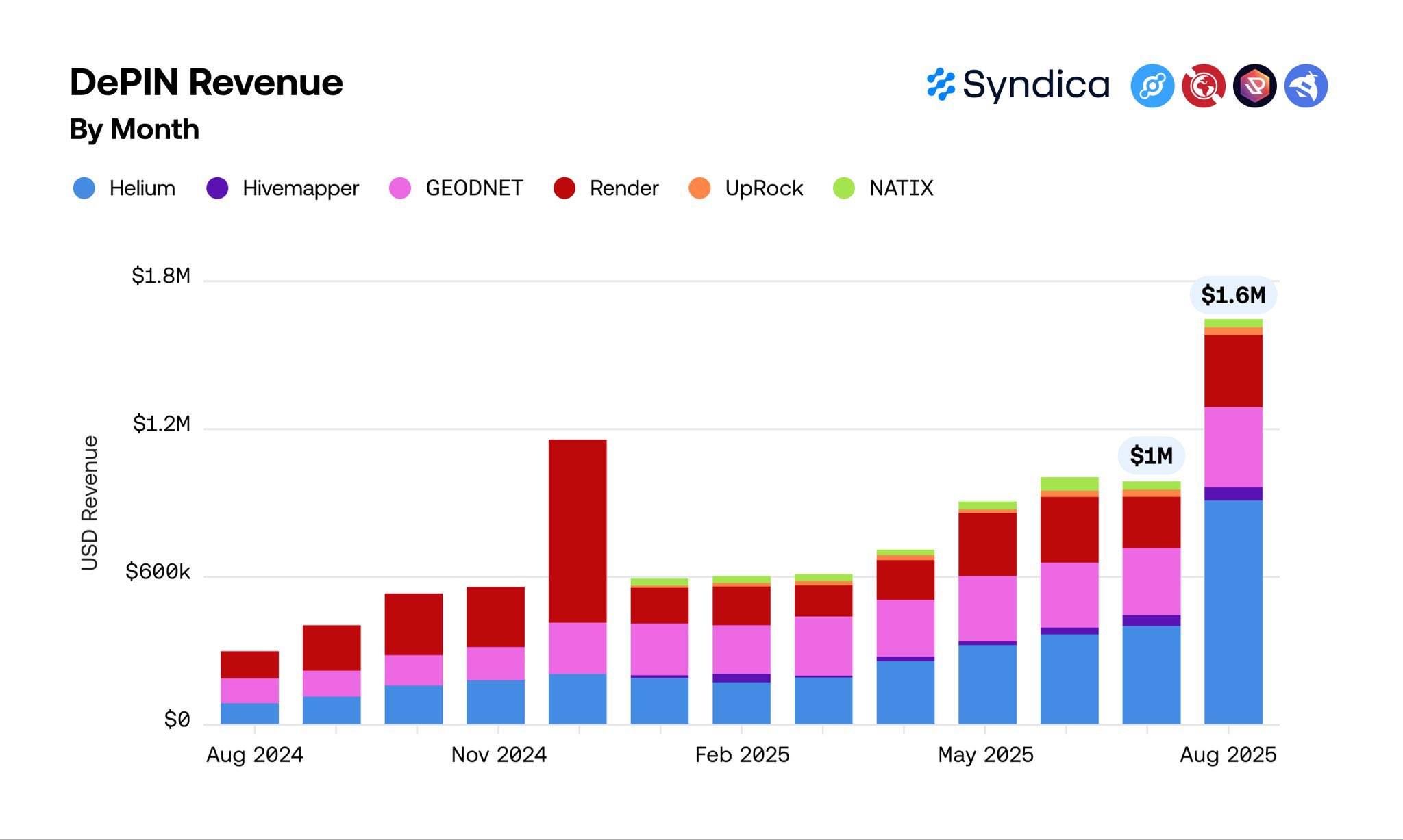 深潮 TechFlow 消息,9 月 24 日,据 SolanaFloor 报道,8 月份基于 Solana 的去中心化物理基础设施(DePIN)项目创造了 160 万美元的收入,创下历史新高。这些项目包括 Helium、Hivemapper、GEODNET、Render Network、Uprock 和 Natix。