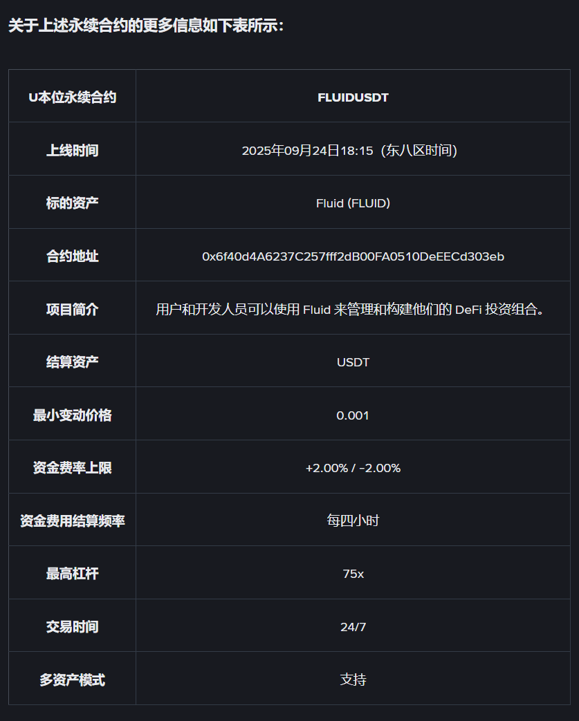 • 2025年09月24日18:15(东八区时间):FLUIDUSDT永续合约,最高杠杆可达75倍。