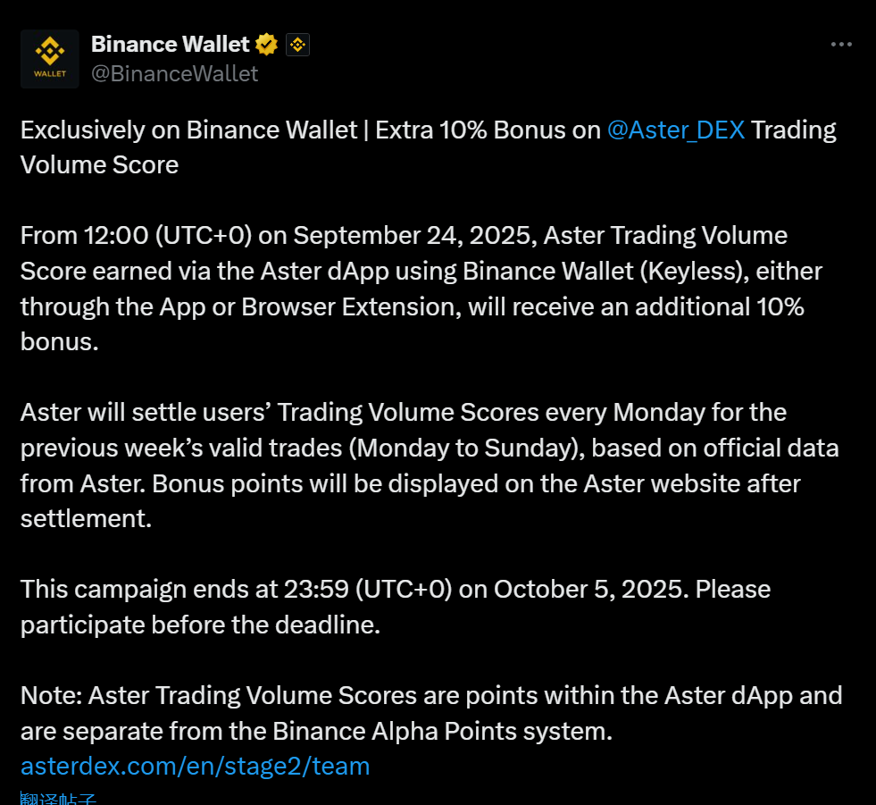 从 2025 年 9 月 24 日 12:00(UTC+0)开始,用户通过币安钱包在 Aster 中进行交易获得的交易量积分将额外获得 10% 奖励,该功能支持应用程序和浏览器扩展两种方式。