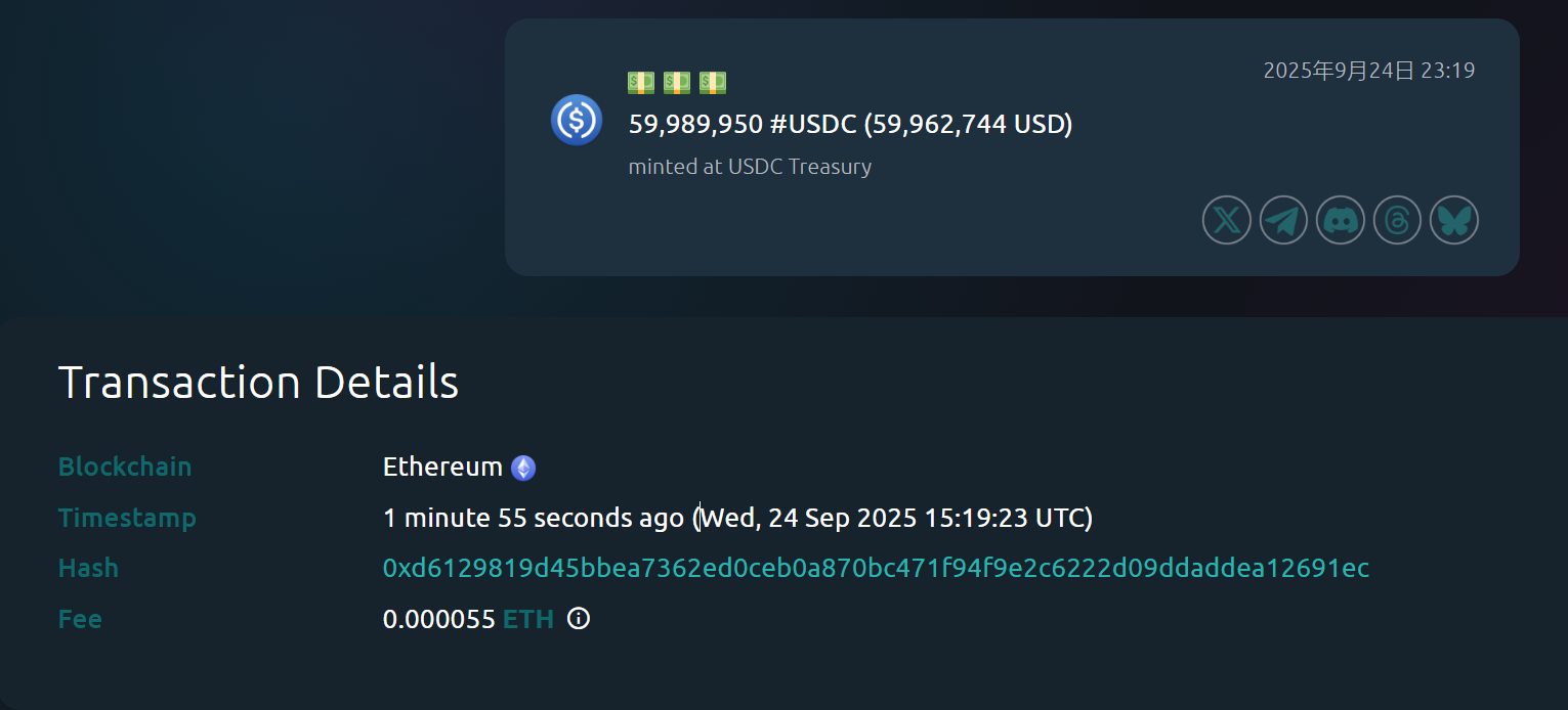 深潮 TechFlow 消息,9 月 24 日,据 Whale Alert 监测,USDC Treasury 约 2 分钟前在以太坊链上铸造 59,989,950 枚 USDC。