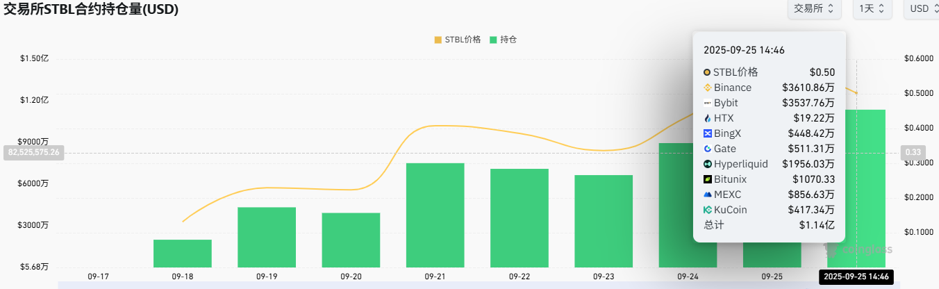 深潮 TechFlow 消息,9 月 25 日,据Coinglass最新数据显示,随着STBL今晨走高,全网STBL合约持仓量已增至2.26亿枚,持仓市值突破1亿美元,现报1.14亿美元,过去24小时增幅19.46%;其中币安STBL合约持仓量触及7188.52万枚,位列第一,持仓市值为3610.86万美元;Bybit的STBL合约持仓量触及7043.97万枚,持仓市值为3537.76万美元。