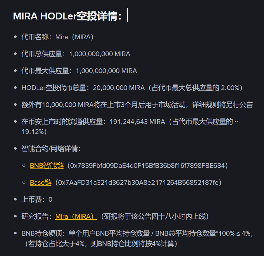 币安 HODLer空投上线Mira(MIRA)