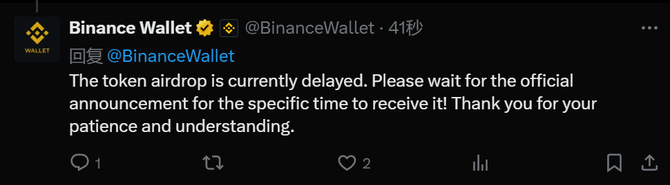 深潮 TechFlow 消息,9 月 25 日,据官方公告,Binance 表示 Plasma(XPL)代币空投目前遇到延迟,具体领取时间请等待后续官方公告。