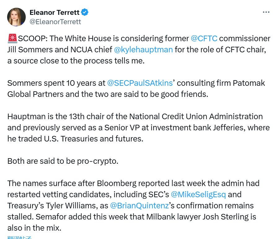 深潮 TechFlow 消息,9 月 25 日,据加密记者 Eleanor Terrett 披露,白宫正在考虑任命前商品期货交易委员会(CFTC)委员 Jill Sommers 和国家信用合作社管理局(NCUA)主席 Kyle Hauptman 担任 CFTC 主席一职。