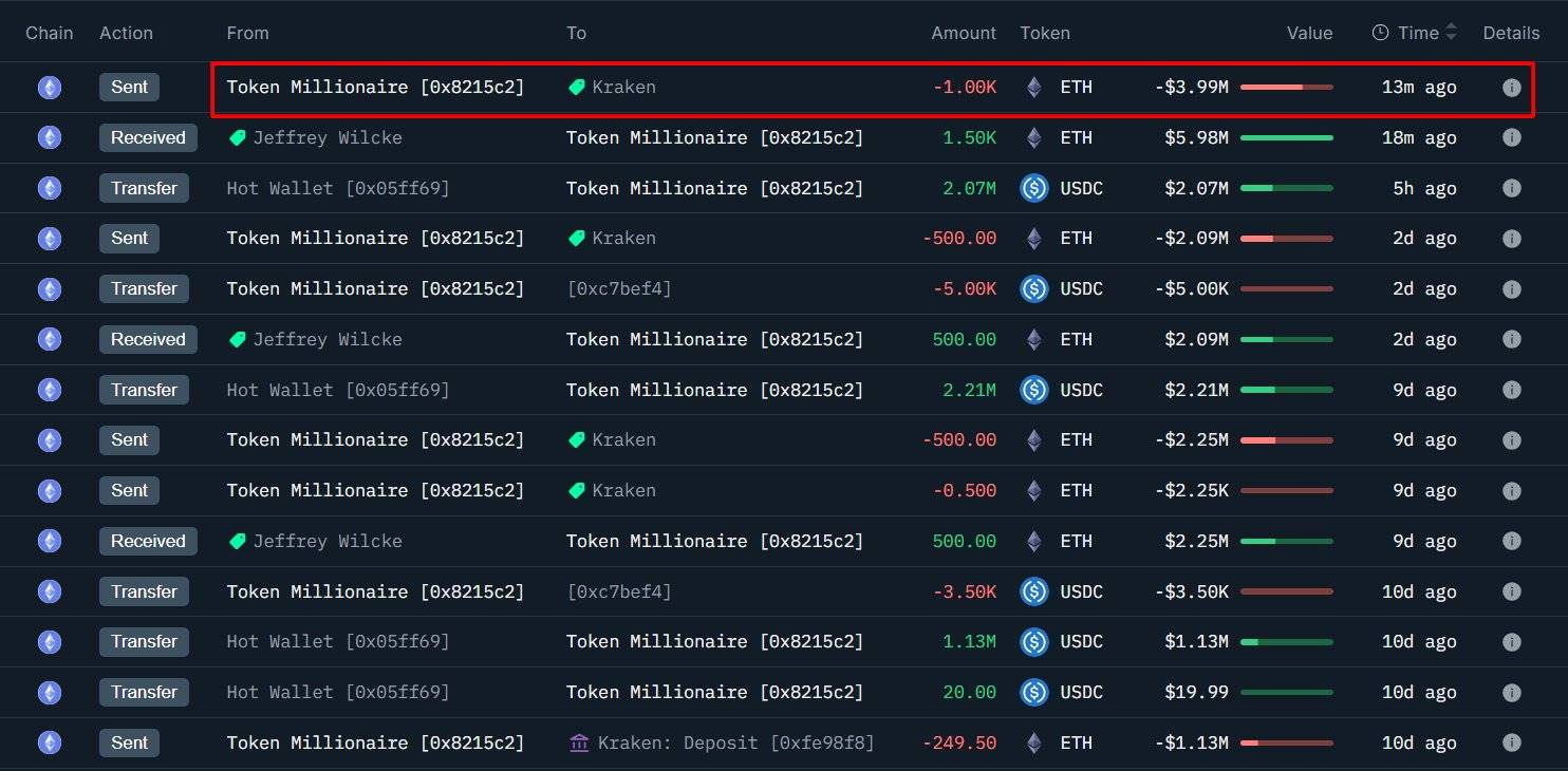 以太坊联创 Jeffrey Wilcke 向 Kraken 存入 1,000 枚 ETH,价值约 400 万美元