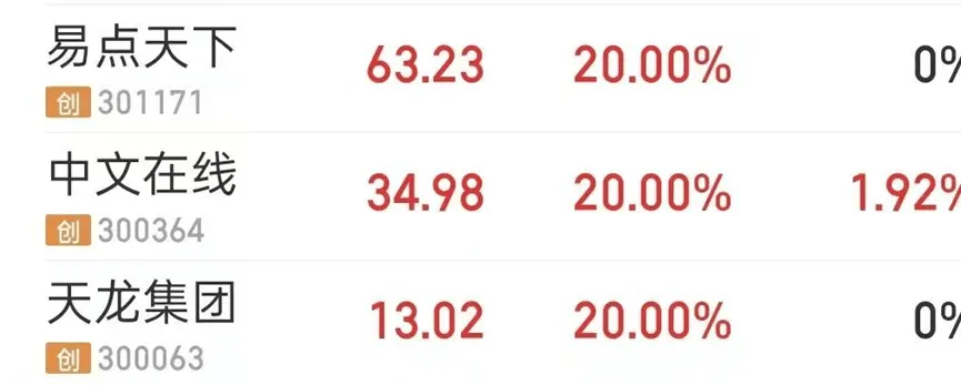 Trên thị trường, nhiều cổ phiếu như Zhi De Mai, Zhuo Yi Xin Xi tăng trần; các cổ phiếu Yi Dian Tian Xia, Zhong Wen Online, Tian Long Group tạo thành tổ hợp mới mang tên "Dễ Trung Thiên", đều ghi nhận mức tăng trần 20CM vào buổi sáng.