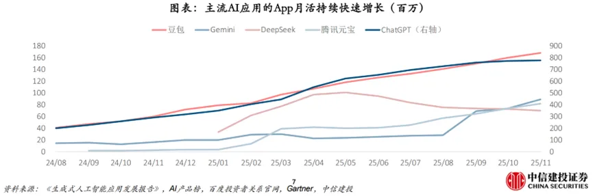 Zhongxin Jian Tou trích dẫn dữ liệu: ChatGPT và ứng dụng Dou Bao đạt mức người dùng hoạt động hàng tháng lần lượt là 780 triệu và 170 triệu, tỷ lệ thâm nhập đều vượt quá 10%; trong khi đó, ví dụ như Baidu, mức người dùng hoạt động hàng tháng của công cụ tìm kiếm truyền thống dao động trong khoảng 650–750 triệu, xu hướng ổn định.