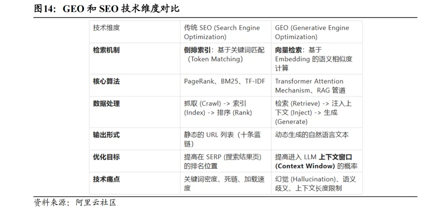 Guotai Haitong mô tả sự khác biệt một cách “kỹ thuật” hơn: cơ chế cốt lõi của tìm kiếm truyền thống là khớp (chỉ mục đảo ngược, PageRank), SEO là tối ưu hóa chắc chắn; cơ chế cốt lõi của tìm kiếm AI là phân tích (truy xuất vector + RAG), GEO là tối ưu hóa xác suất — mọi hành động bạn thực hiện đều nhằm nâng cao xác suất “được gọi lại, được tin tưởng, được trích dẫn”.