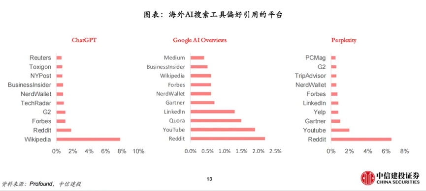 Zhongxin Jian Tou trích dẫn khảo sát từ công ty GEO nước ngoài Profound: các nền tảng mà ChatGPT trích dẫn nhiều nhất gồm Wikipedia, Reddit, Forbes; Google AI Overviews và Perplexity lại ưa thích Reddit, YouTube, Quora, Gartner hơn.