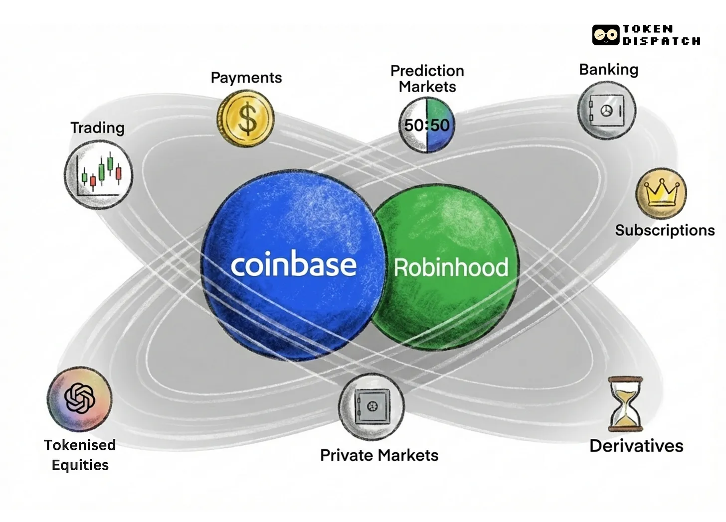 Mảng mã hóa tài sản sẽ là một lĩnh vực cạnh tranh phức tạp hơn nữa. Coinbase coi đây là vấn đề hạ tầng: phát hành cổ phiếu được mã hóa nội bộ và thiết lập quan hệ với cơ quan quản lý để thực hiện giao dịch trái phiếu và chứng khoán trên blockchain. Trong khi đó, Robinhood lại coi đây là vấn đề tiếp cận người tiêu dùng: cho phép giao dịch token cổ phiếu của các công ty chưa niêm yết. Hai bên chọn những con đường khác nhau để giải quyết các khía cạnh khác nhau của cùng một vấn đề.