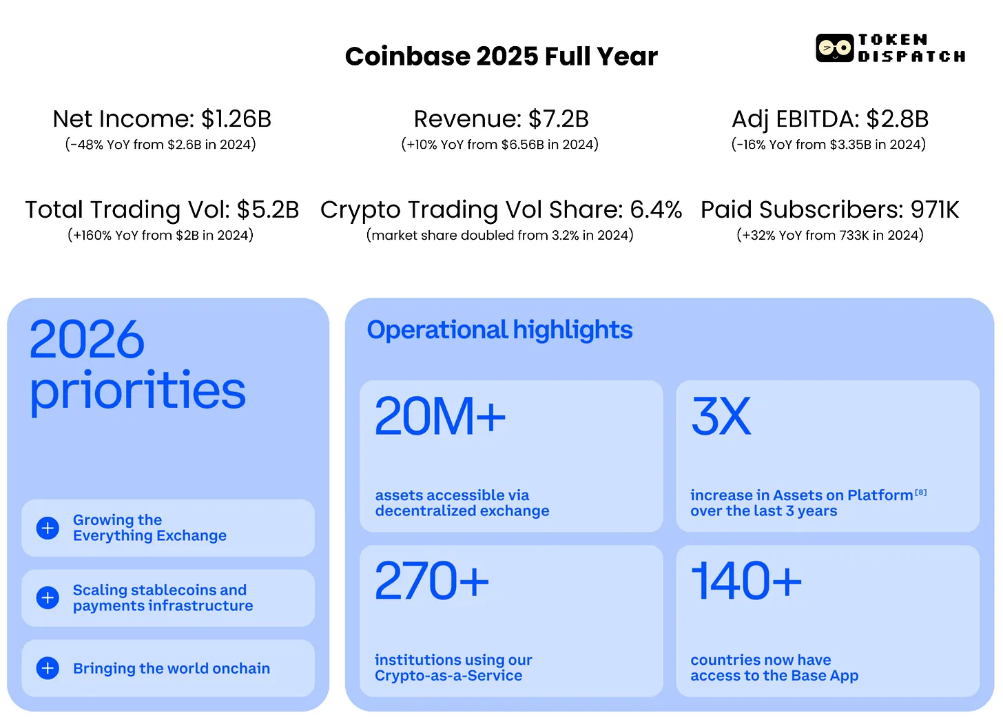 Kết quả quý IV năm 2025 của Coinbase ghi nhận khoản lỗ ròng 667 triệu USD, có thể khiến người đọc cảm thấy quý này thật tệ hại. Nhưng con số cần được hiểu trong bối cảnh cụ thể. Trong quý này, Coinbase cũng chịu khoản lỗ chưa thực hiện 718 triệu USD từ danh mục tiền mã hóa nắm giữ, đồng thời ghi nhận khoản giảm giá trị đầu tư vào Circle lên tới 395 triệu USD. Loại bỏ những khoản lỗ trên sổ sách — không liên quan đến dòng tiền — thì Coinbase vẫn duy trì lợi nhuận điều chỉnh liên tục trong 12 quý.