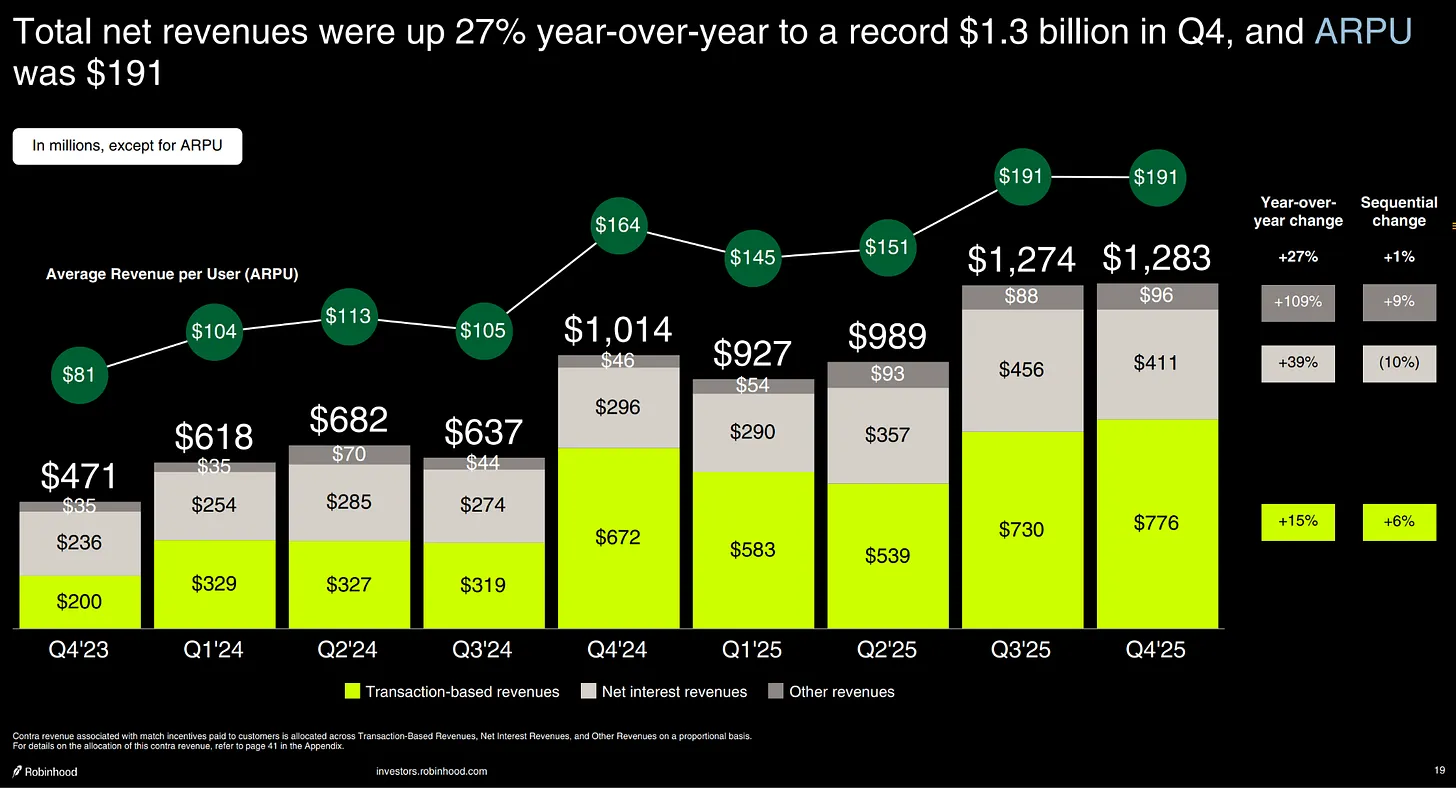 Hiệu suất quý IV của Robinhood thực tế khá tốt, song lại bị thị trường trừng phạt vì những lý do không phù hợp. Do khối lượng giao dịch tiền mã hóa giảm và mùa bóng đá kết thúc, doanh thu của công ty không đạt kỳ vọng — nhưng đối với tôi, những yếu tố này chẳng phải trọng tâm.