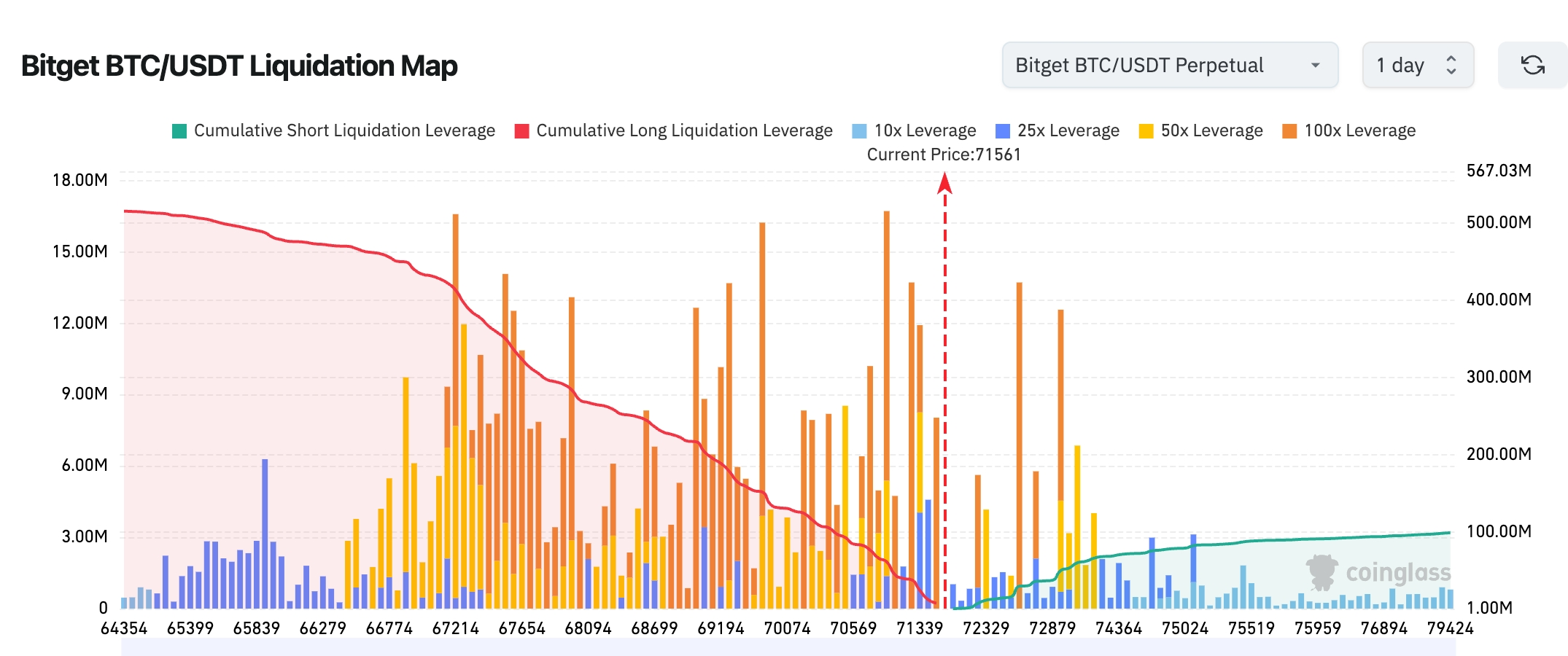 - Bản đồ thanh toán bắt buộc BTC/USDT trên Bitget: Tại mức giá hiện tại (khoảng 71.561 USD), vùng phía dưới tập trung dày đặc các vị thế mua (long) có đòn bẩy cao (đường đỏ liên tục đi xuống), cho thấy nếu giá giảm sẽ kích hoạt loạt thanh toán bắt buộc dây chuyền, tạo thành “thác thanh khoản” hướng xuống. Các vị thế bán (short) cần thanh toán bắt buộc ở vùng phía trên tương đối phân tán nhưng đang dần tích lũy; nếu giá tăng vọt phá vỡ vùng 71.500–73.000 USD, có thể xảy ra hiện tượng “ép short” ngắn hạn.