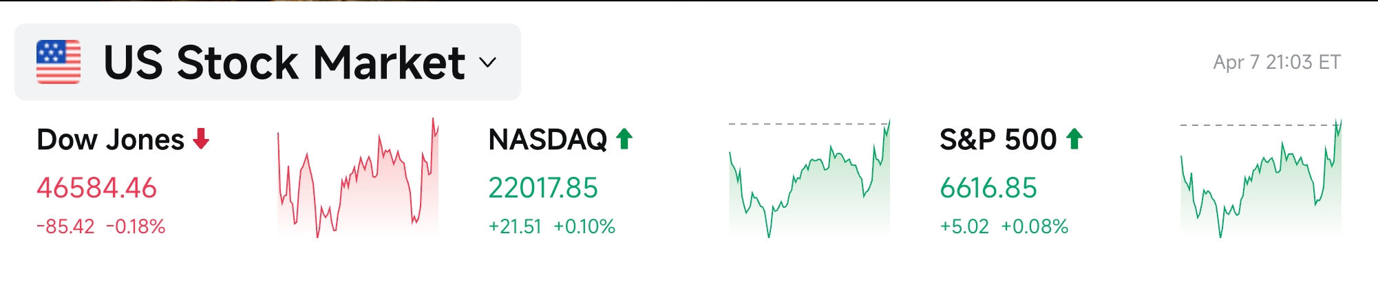 - Chỉ số S&P 500: Tăng 0,08%, đóng cửa ở mức 6.616,85 điểm; đặc điểm nổi bật là đảo chiều tăng vào cuối phiên và đạt chuỗi 5 phiên tăng liên tiếp, nhờ tín hiệu ngừng bắn làm đảo ngược đà giảm ban đầu.