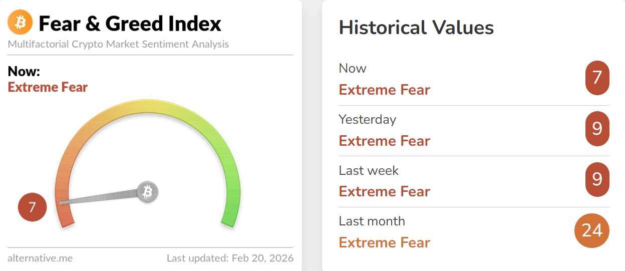 TechFlow đưa tin, ngày 20 tháng 2, theo dữ liệu từ Alternative.me, chỉ số Sợ hãi & Tham lam của thị trường tiền mã hóa hôm nay giảm xuống còn 7 (hôm qua chỉ số này là 9), cho thấy tâm lý «sợ hãi cực độ» trên thị trường tiếp tục gia tăng.