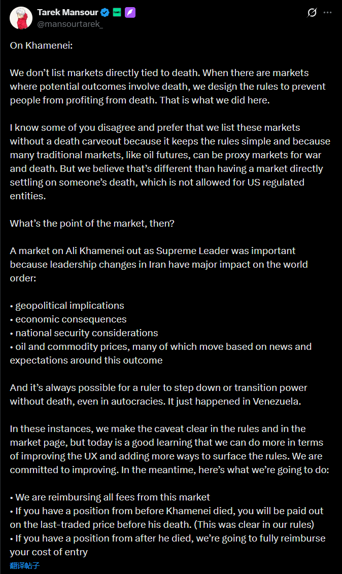 Ông Tarek Mansour khẳng định: “Không một người dùng nào sẽ chịu lỗ dù chỉ một đô la Mỹ trong thị trường này. Chúng tôi sẽ thanh toán thị trường dựa trên giá giao dịch cuối cùng trước thời điểm ông Khamenei qua đời, tức lúc 1 giờ 14 phút sáng giờ Miền Đông Hoa Kỳ hôm nay.”