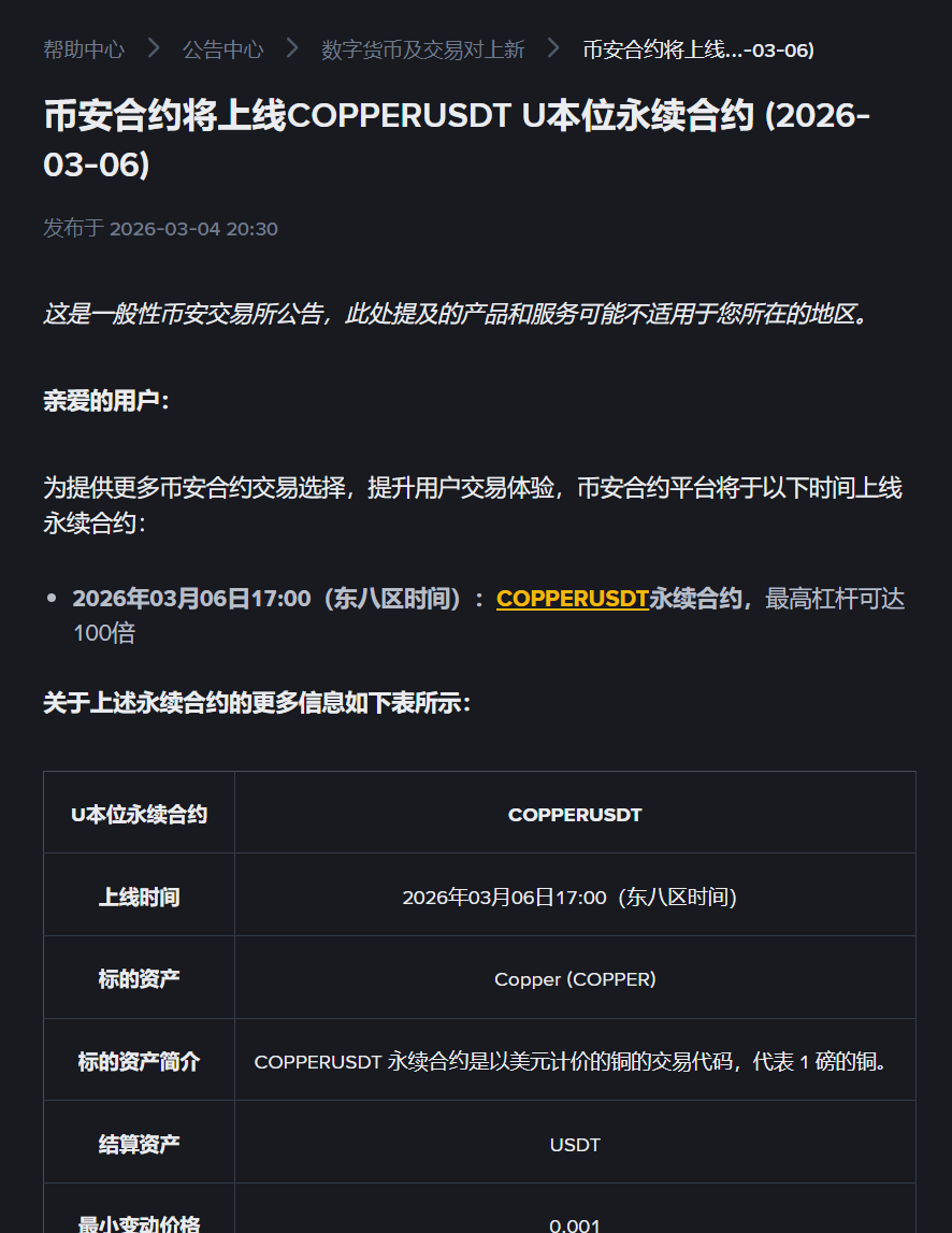 Theo thông báo chính thức, nền tảng Hợp đồng Tương lai của Binance sẽ ra mắt hợp đồng tương lai perpetual COPPERUSDT vào lúc 17:00 (giờ múi Đông 8) ngày 06/03/2026, với đòn bẩy tối đa lên đến 100 lần.