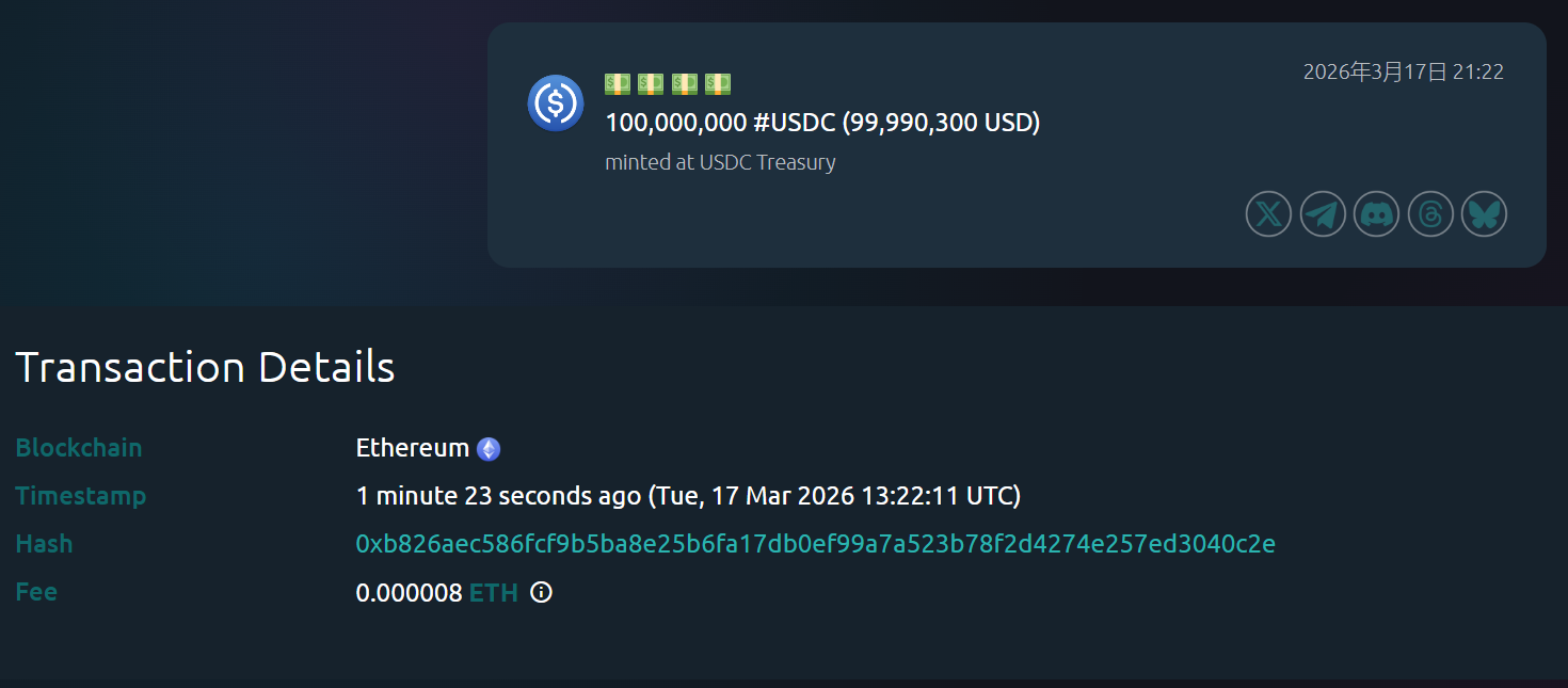 TechFlow đưa tin, ngày 17 tháng 3, theo dữ liệu từ Whale Alert, Kho bạc USDC vừa phát hành thêm 100 triệu USDC trên chuỗi Ethereum.